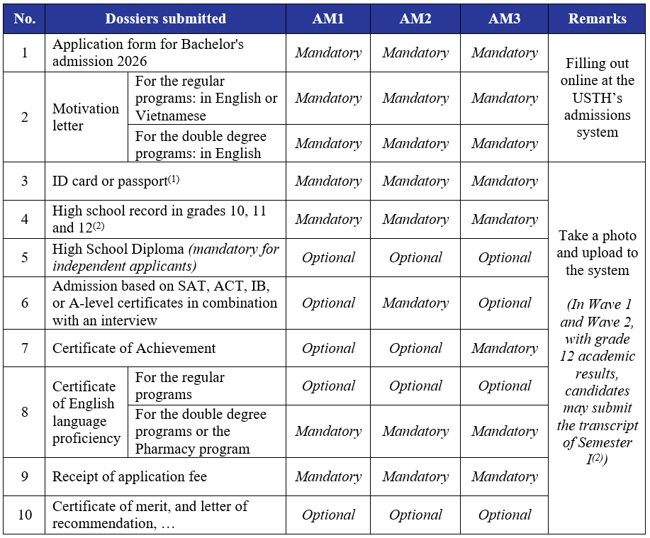 (2) For candidates submitting applications in wave 1 and wave 2 are required to update their full grade 12 academic results on the USTH online admissions system after completing the program. Concerning admissions method 2, the admissions results will only be recognized if their high school academic results meet the threshold specified by the USTH.